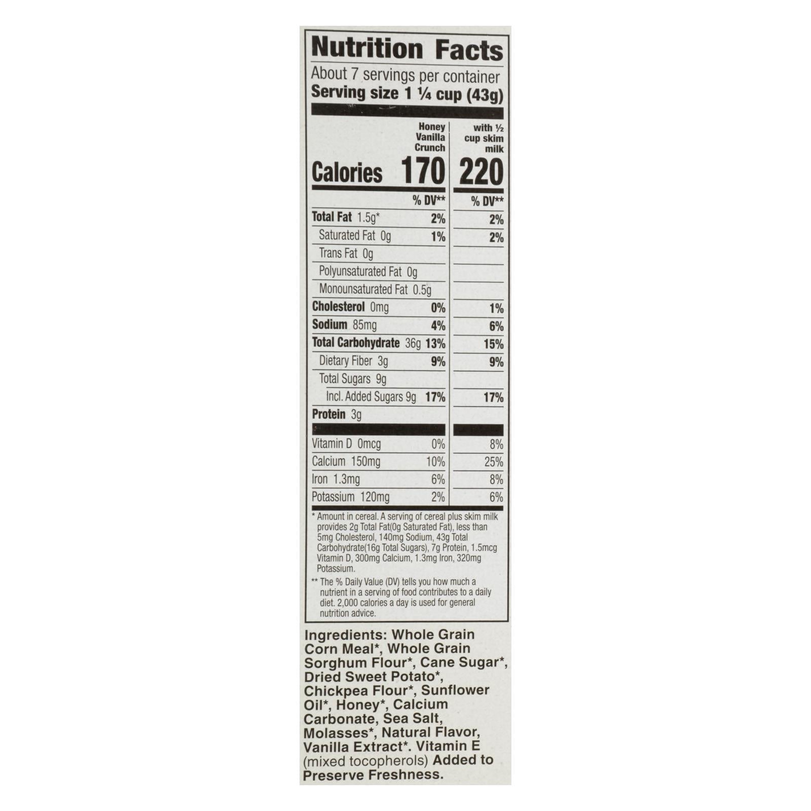 ingredients : whole grain corn meal;whole grain sorghum flour;cane sugar;dried sweet potato;chickpea flour;sunflower oil;honey;calcium carbonate;sea salt;molasses;natural flavor;vanilla extract;vitamin e (mixed tocopherols) added to preserve freshness