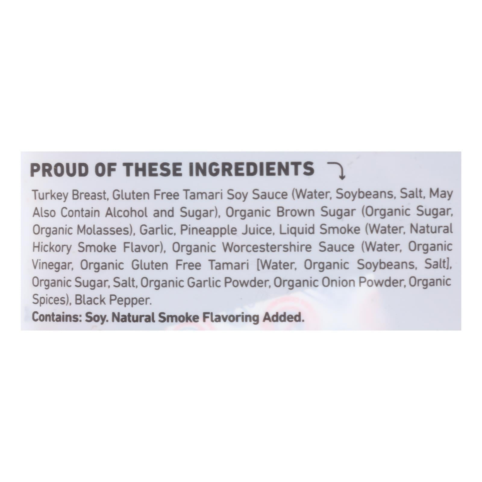 ingredients : turkey breast;gluten free tamari soy sauce;water;soybeans;salt;may also contain alcohol and sugar;organic brown sugar;organic sugar;organic molasses;garlic;pineapple juice;liquid smoke;natural hickory smoke flavor;organic worcestershire sauce;organic vinegar;organic gluten free tamari [water;organic soybeans;salt];organic garlic powder;organic onion powder;organic spices;black pepper