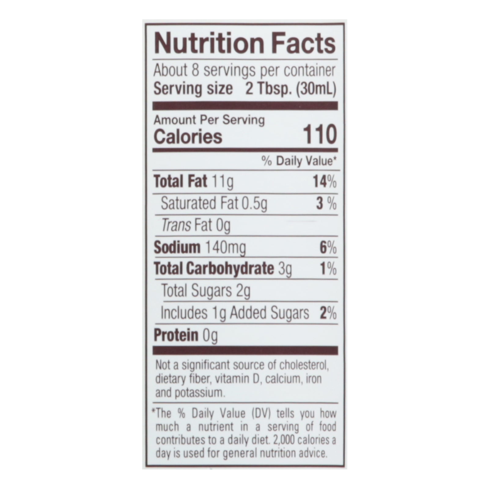 ingredients : vegetable oil blend* (extra virgin olive oil*, high oleic sunflower seed oil*);water;balsamic vinegar* (contains naturally occurring sulfites);evaporated cane sugar;salt;sunflower protein;onion;natural flavor;xanthan gum;spices