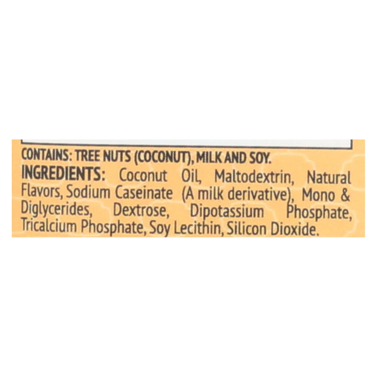 ingredients : coconut oil;maltodextrin;natural flavors;sodium caseinate;a milk derivative;mono & diglycerides;dextrose;dipotassium phosphate;tricalcium phosphate;soy lecithin;silicon dioxide