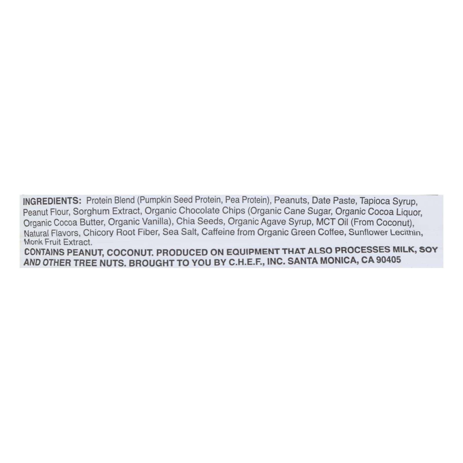 ingredients : protein blend (pumpkin seed protein, pea protein);peanuts;date paste;tapioca syrup;peanut flour;sorghum extract;organic chocolate chips (organic cane sugar, organic cocoa liquor, organic cocoa butter, organic vanilla);chia seeds;organic agave syrup;mct oil (from coconut);natural flavors;chicory root fiber;sea salt;caffeine from organic green coffee;sunflower lecithin;monk fruit extract
