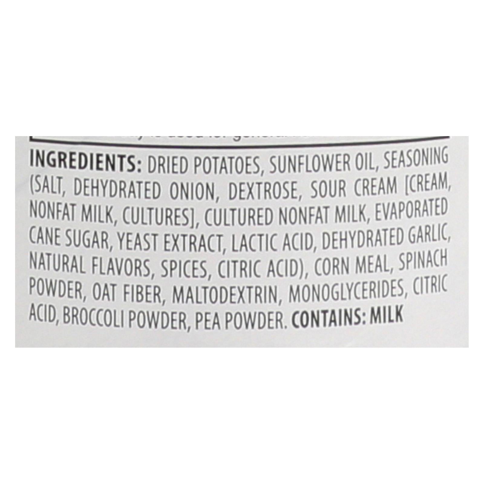 ingredients : dried potatoes;sunflower oil;seasoning;salt;dehydrated onion;dextrose;sour cream [cream;nonfat milk;cultures];cultured nonfat milk;evaporated cane sugar;yeast extract;lactic acid;dehydrated garlic;natural flavors;spices;citric acid;corn meal;spinach powder;oat fiber;maltodextrin;monoglycerides;broccoli powder;pea powder