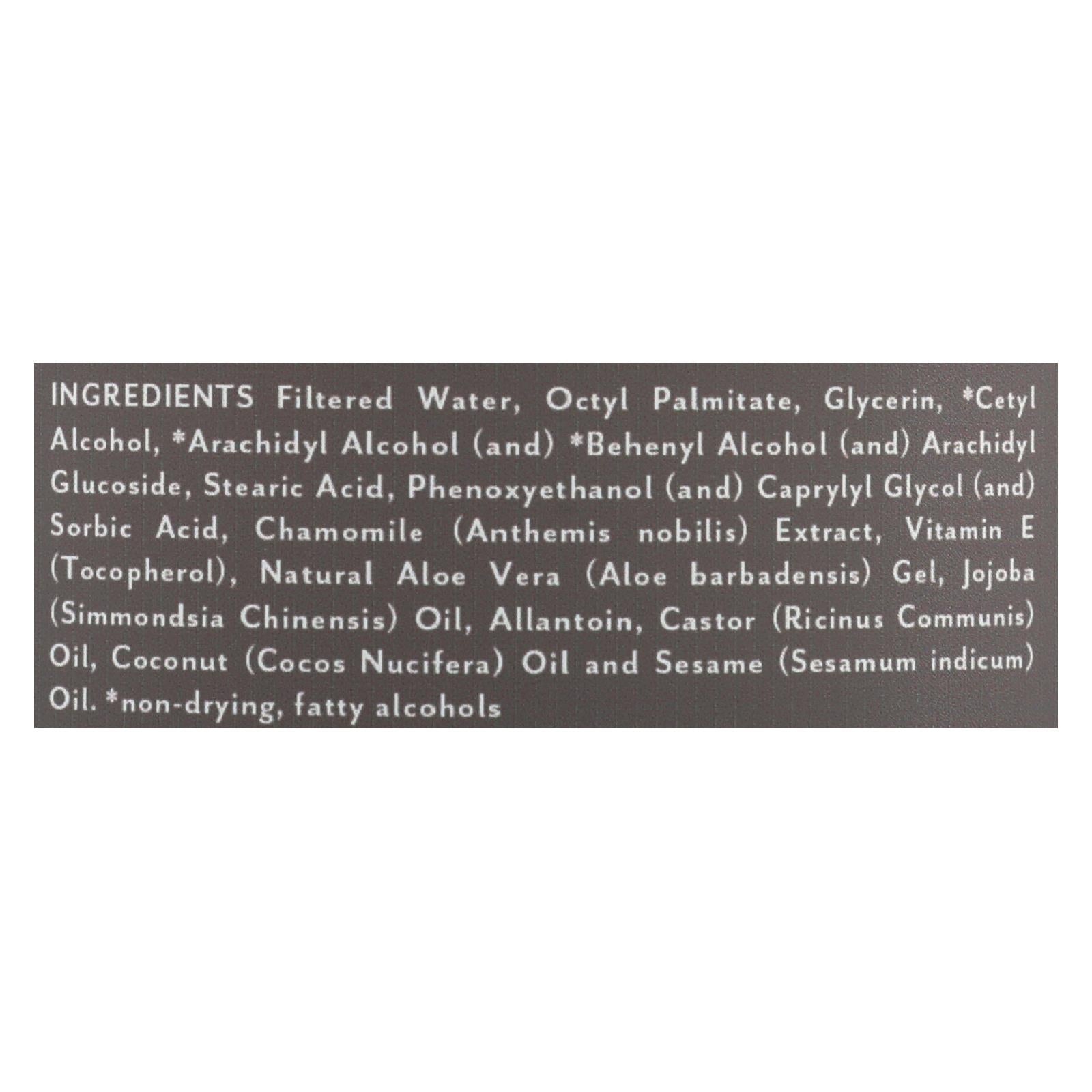ingredients : filtered water;octyl palmitate;glycerin;cetyl alcohol;arachidyl alcohol;and;behenyl alcohol;arachidyl glucoside;stearic acid;phenoxyethanol;caprylyl glycol;sorbic acid;chamomile;anthemis nobilis;extract;vitamin e;tocopherol;natural aloe vera;aloe barbadensis;gel;jojoba;simmondsia chinensis;oil;allantoin;castor;ricinus communis;coconut;cocos nucifera;oil and sesame;sesamum indicum