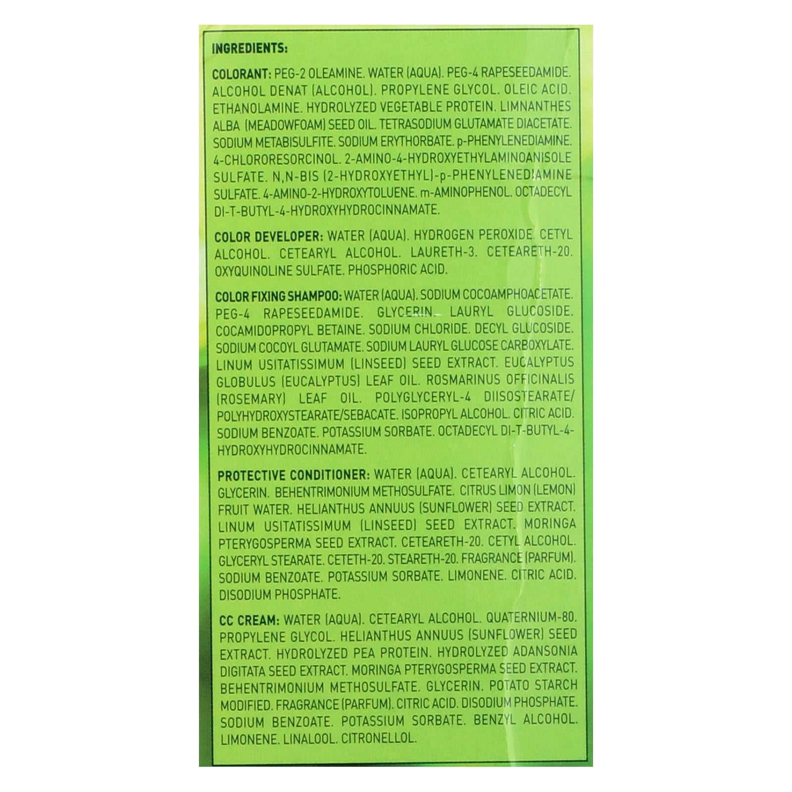 ingredients : cc cream: water;aqua;cetearyl alcohol;quaternium-80;propylene glycol;helianthus annuus;sunflower;seed extract. Hydrolyzed pea protein. Hydrolyzed adansonia digitata seed extract. Moringa pterygosperma seed extract. Behentrimonium methosulfate. Glycerin. Potato starch modified. Fragrance;parfum;citric acid. Disodium phosphate. Sodium benzoate. Potassium sorbate. Benzyl alcohol. Limonene. Linalool. Citronellol;color developer: water;hydrogen peroxide. Cetyl alcohol. Cetearyl alcohol. Laureth-3. Ce