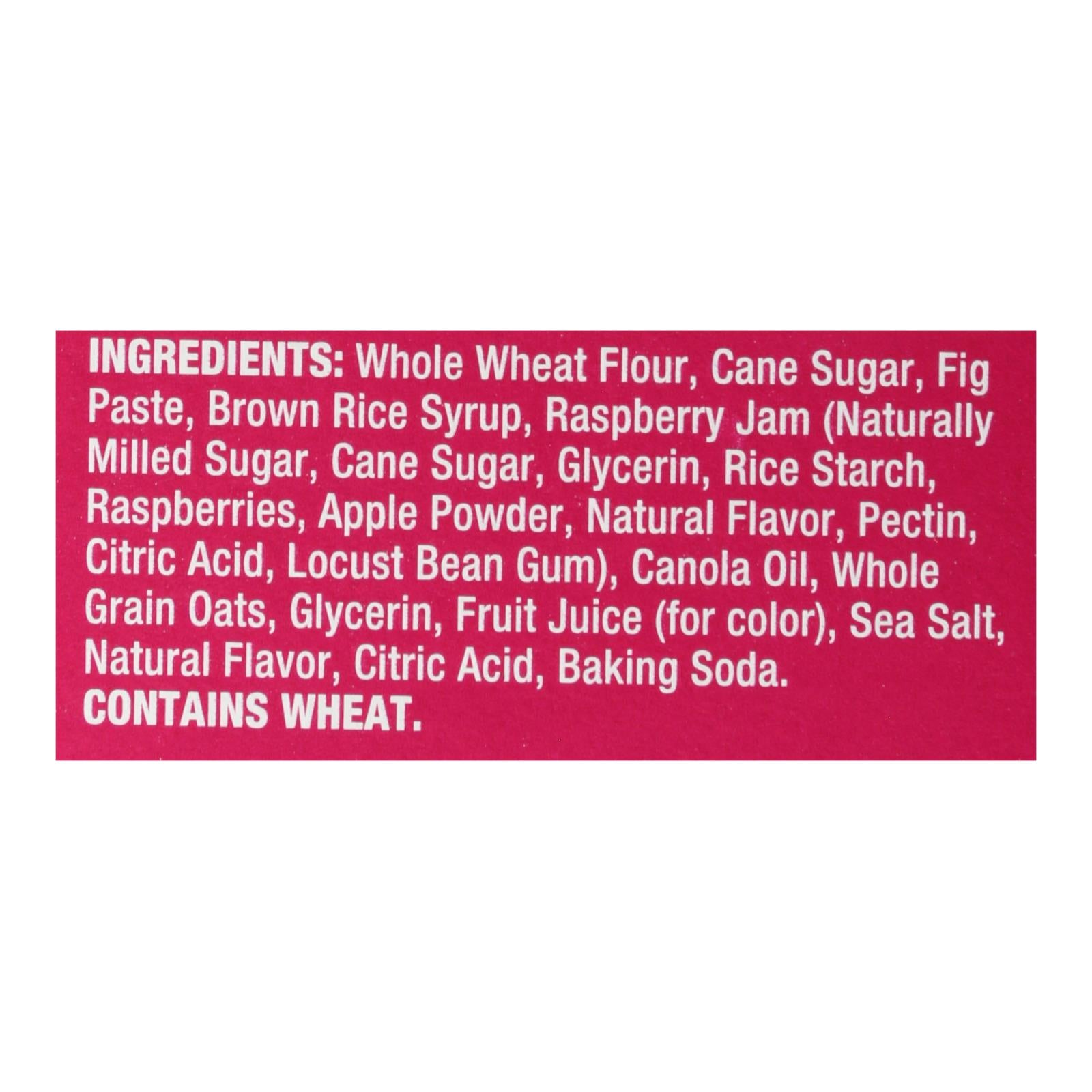 ingredients : whole wheat flour;cane sugar;fig paste;brown rice syrup;raspberry jam;naturally milled sugar;organic cane sugar;glycerin;organic rice starch;raspberries;apple powder;natural flavor;pectin;citric acid;locust bean gum;canola oil;whole grain oats;fruit juice;for color;sea salt;baking soda