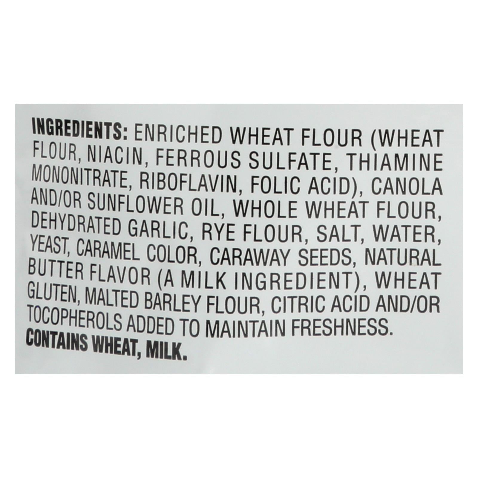 ingredients : enriched wheat flour (wheat flour, niacin, ferrous sulfate, thiamine mononitrate, riboflavin, folic acid);canola and/or sunflower oil;whole wheat flour;dehydrated garlic;rye flour;salt;water;yeast;caramel color;caraway seeds;natural butter flavor (a milk ingredient);wheat gluten;malted barley flour;citric acid and/or tocopherols added to maintain freshness