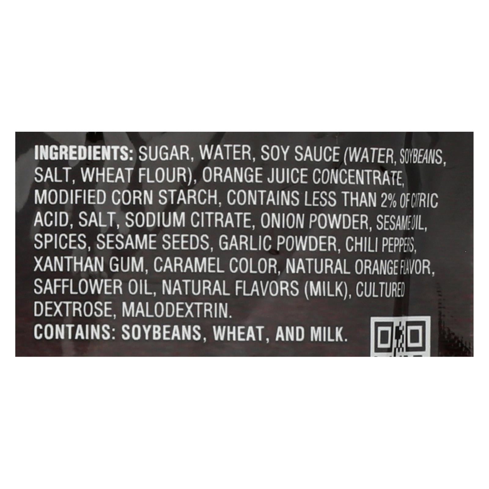 ingredients : sugar;water;soy sauce;soy beans;salt;wheat flour;ornage juice concentrate;modified corn starch;contains less than 2% of citric acid;sodium citrate;onion powder;sesame oil;spices;sesame seeds;garlic powder;chili peppers;xanthan gum;caramel color;natural ornage flavor;safflower oil;natural flavors;milk;cultured dextrose;malodextrin
