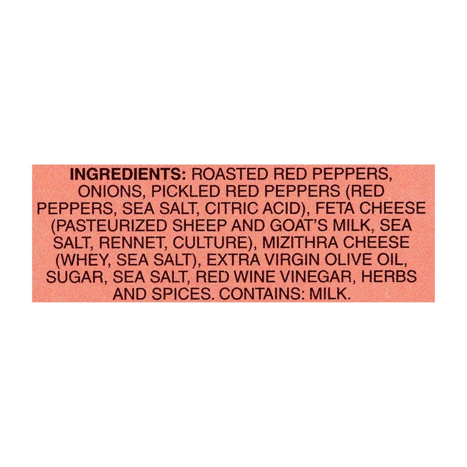 ingredients : roasted red peppers;onions;pickled red peppers (red peppers, sea salt, citric acid);feta cheese (pasteurized sheep and goat's milk, sea salt, rennet, culture);mizithra cheese (milk whey, salt);extra virgin olive oil;sugar;sea salt;red wine vinegar;herbs and spices