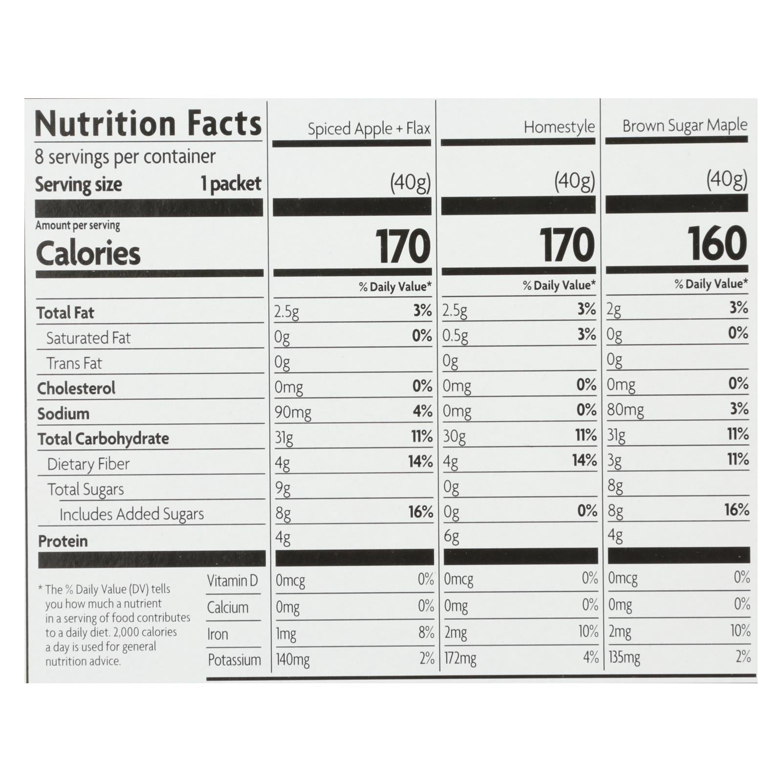 ingredients : brown sugar maple: gluten free whole grain rolled oats*, brown sugar*, cane sugar*, maple sugar*, rolled amaranth*, rolled quinoa*, sorghum flour*, natural maple flavor, sea salt;homestyle: gluten free whole grain rolled oats;spiced apple + flax: gluten free whole grain rolled oats*, cane sugar*, dried apple*, flax seeds*, brown sugar flavor*, cinnamon*, sea salt