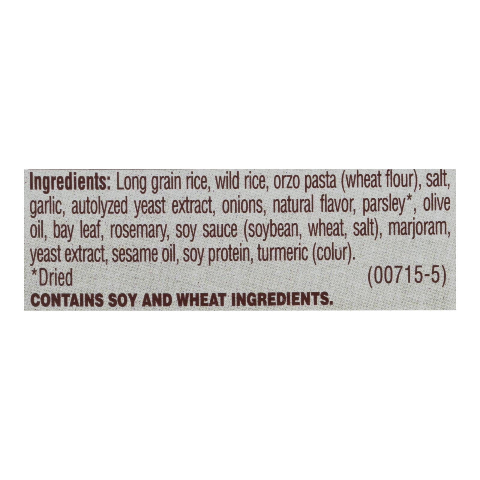 ingredients : long grain rice;wild rice;orzo pasta;wheat flour;salt;garlic;autolyzed yeast extract;onions;natural flavor;parsley;olive oil;bay leaf;rosemary;soy sauce;soybean;wheat;marjoram;yeast extract;sesame oil;soy protein;turmeric;color