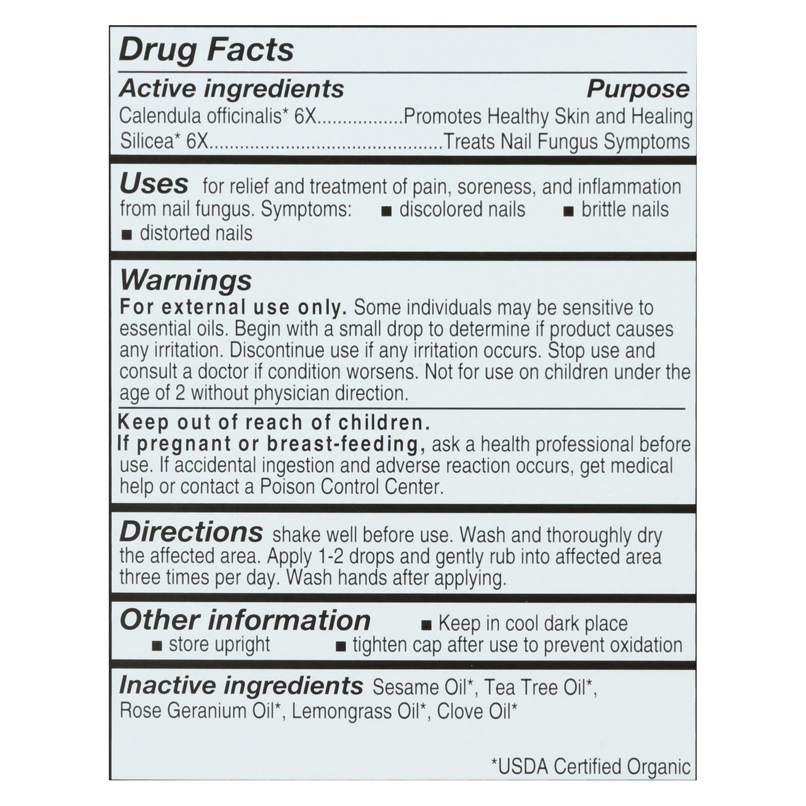 ingredients : calendula officinalis* 6x purpose promotes healthy skin and healing silicea* 6x purpose treats nail fungus symptoms;sesame oil;tea tree oil;rose geranium oil;lemongrass oil;clove oil