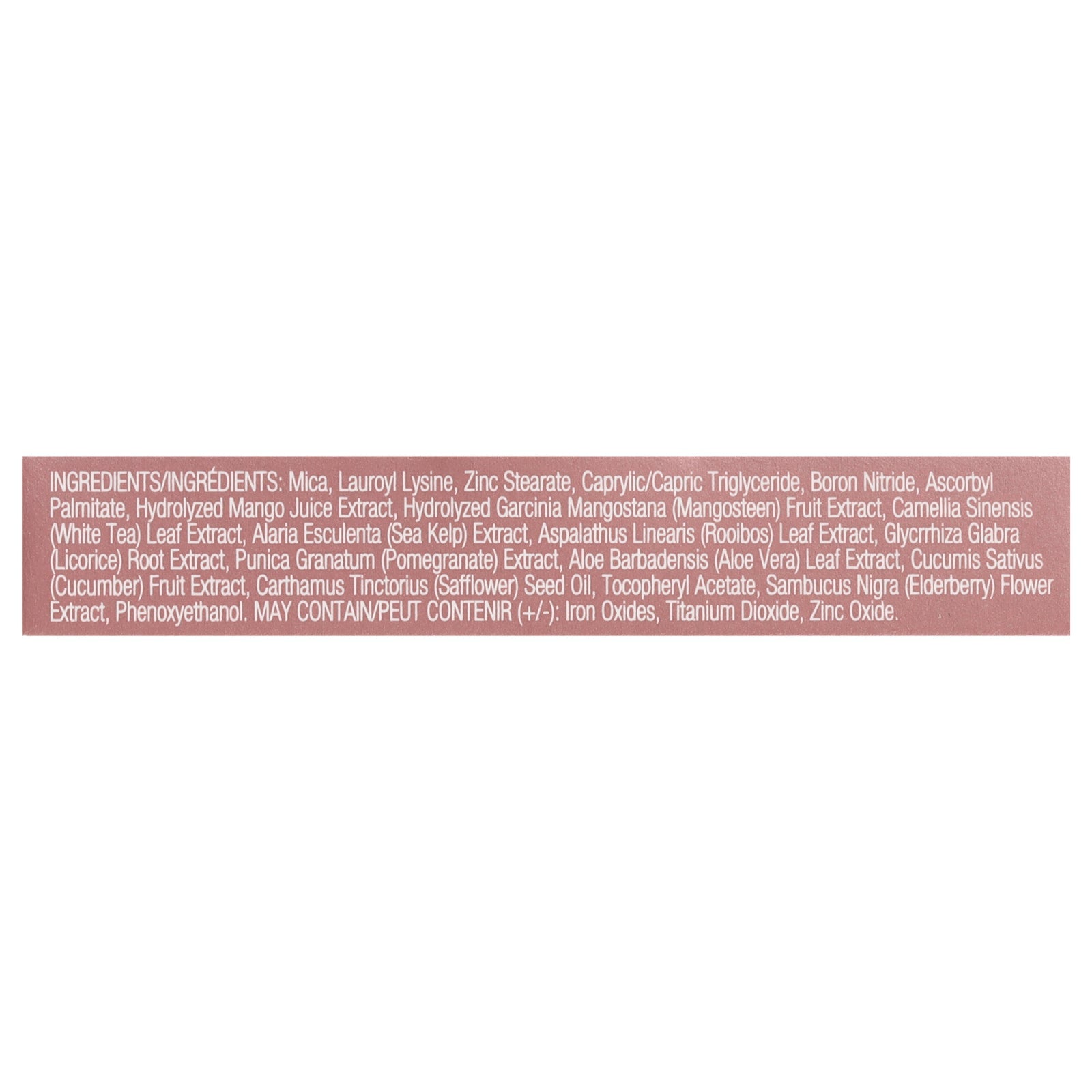 ingredients : mica;lauroyl lysine;zinc stearate;caprylic/capric triglyceride;boron nitride;ascorbyl palmitate;hydrolyzed mango juice extract;hydrolyzed garcinia mangostana (mangosteen) fruit extract;camellia sinensis (white tea) leaf extract;alaria esculenta (sea kelp) extract;aspalathus linearis (rooibos) leaf extract;glycyrrhiza glabra (licorice) root extract;punica granatum (pomegranate) extract;aloe barbadensis (aloe vera) leaf extract;cucumis sativus (cucumber) fruit extract;carthamus tinctorius (safflow