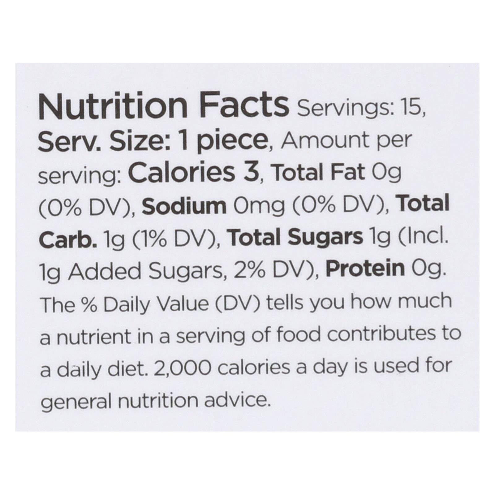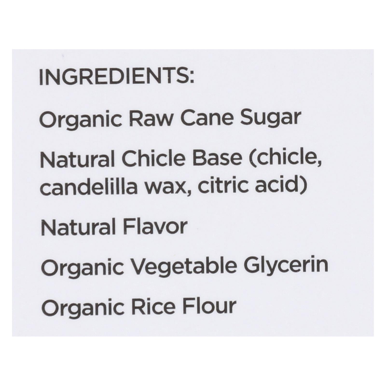 ingredients : organic raw cane sugar natural chicle base (chicle, candelilla wax, citric acid) natural flavor organic vegetable glycerin organic rice flour