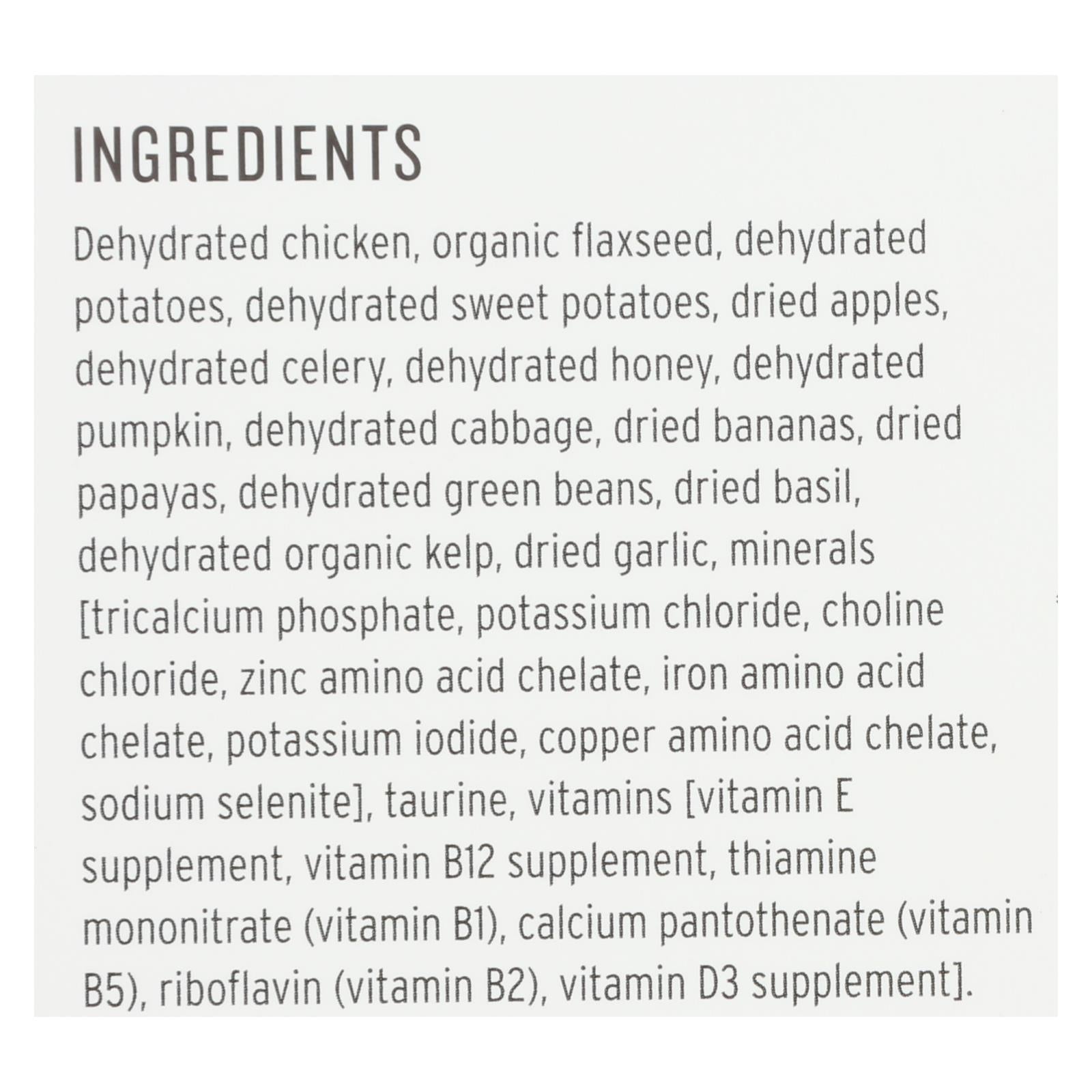 ingredients : dehydrated chicken;organic flaxseed;dehydrated potatoes;dehydrated sweet potatoes;dried apples;dehydrated celery;dehydrated honey;dehydrated pumpkin;dehydrated cabbage;dried bananas;dried papayas;dehydrated green beans;dried basil;dehydrated organic kelp;dried garlic;minerals [tricalcium phosphate;potassium chloride;choline chloride;zinc amino acid chelate;iron amino acid chelate;potassium iodide;copper amino acid chelate;sodium selenite];vitamins [vitamin e supplement;vitamin b12 supplement;thi