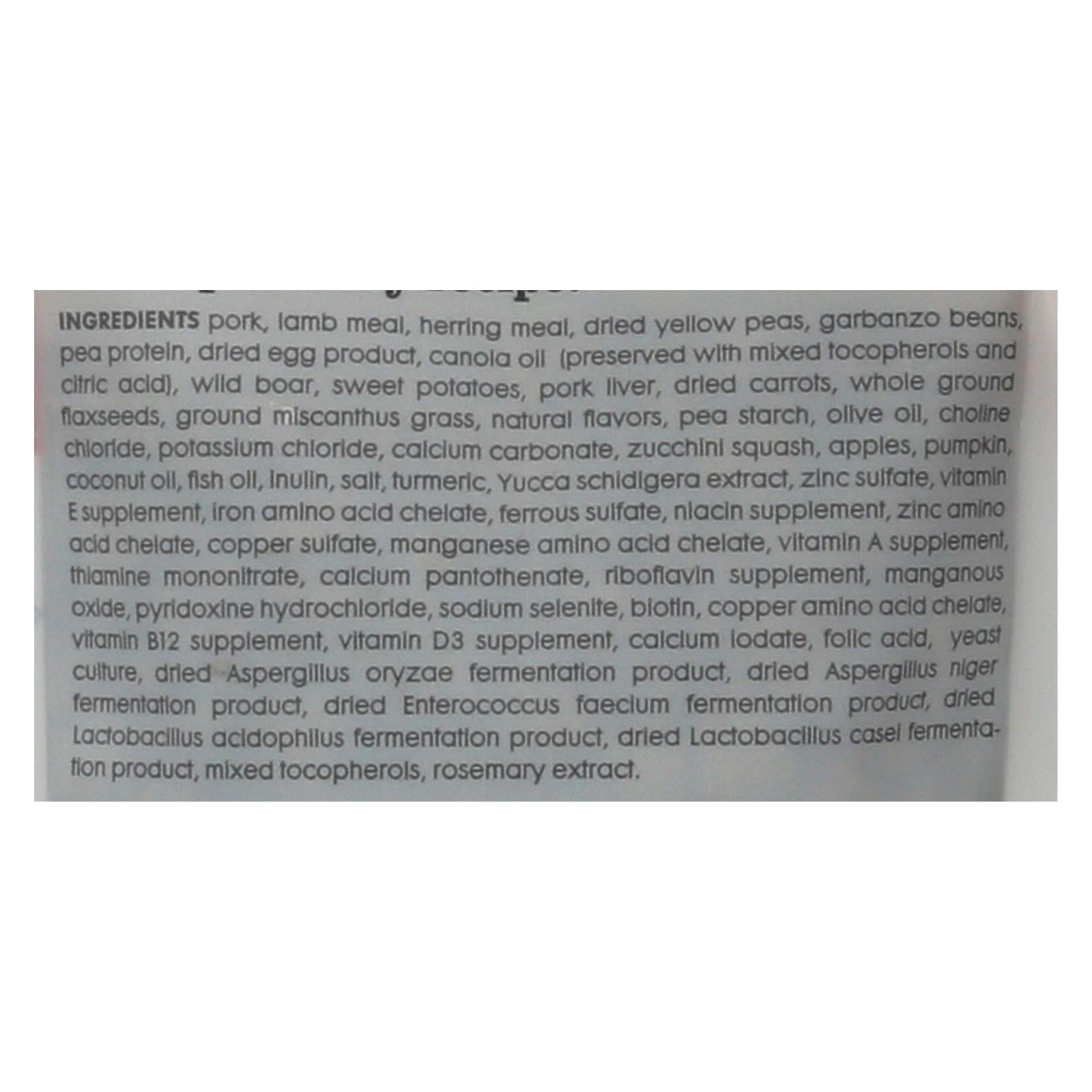 ingredients : pork;beef meal;herring meal;peas;chickpeas;pea protein;dried egg product;canola oil;preserved with mixed tocopherols;pea starch;wild boar;sweet potatoes;pork liver;dried carrots;whole ground flaxseeds;ground miscanthus grass;natural flavors;olive oil;vitamin a supplement;vitamin d3 supplement;vitamin e supplement;niacin supplement;pantothenic acid;pyridoxine hydrochloride;riboflavin supplement;folic acid;biotin;vitamin b12 supplement;choline chloride;potassium chloride;apples;yeast culture;sodiu